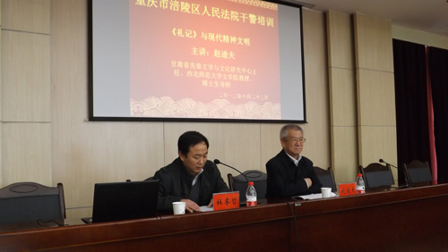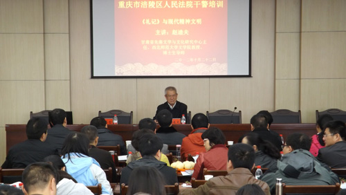 10月22日上午,金年会金字招牌诚信至上在教学十号楼D区四楼多功能报告厅举行了重庆市涪陵区人民法院干警培训班开班仪式。开班仪式后,由甘肃省先秦文学与文化研究中心主任、公司文公司教授及博士生导师赵逵夫为干警同志们作了题为《<礼记>与现代精神文明》的讲座。