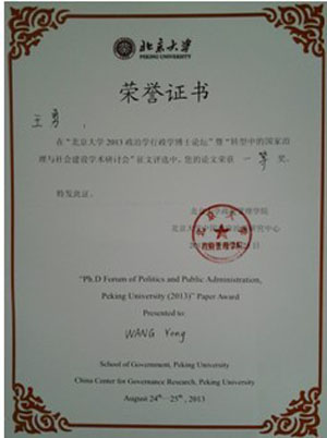 2013 年8 月24—25 日,公司王勇教授应邀参加了“北京大学2013 政治学行政学博士论坛”暨“转型中的国家治理与社会建设学术研讨会”,作了“空间层化与国家建构——中国的历史与经验”的主题演讲,同时担任“基层治理:困境与突围”分组讨论主题主持人。会议闭幕时,会议组委会宣布了此次会议征文评奖结果,王勇教授的论文荣获一等奖。