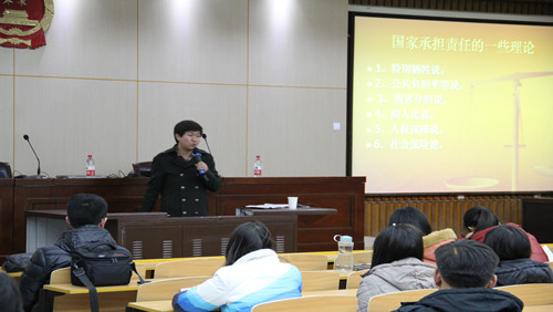 龙鑫法官首先详细为大家介绍了国家赔偿的概念,性质特征,并结合具体案例向大家说明国家赔偿的适用范围以及国家赔偿的标准。通过对这些案例的讲解,龙法官向同学们介绍了目前法院审判工作的实际状况,并对近年来省内外多起有重大影响的冤假错案的成因进行了分析总结:一是受陈旧法制观念的制约,强调命案必破;二是复仇心理泛滥;三是法院的审判工作受到外界的不当干预;四是不科学的激励机制;五是刑侦技术的落后。同学们在了解相关问题后与龙鑫法官展开交流互动,进行了有益的讨论与思考。接着龙法官为大家介绍了相关法律文书的写作技巧及大陆法系国家法官的思维方式,如德国法官习惯使用的“归入法”等。龙法官的讲授生动活泼,幽默风趣,展现出了深厚的理论水平,使得同学们在会心一笑中领略到法律的博大精深及优秀法律人的魅力。讲座的最后,龙法官结合自身经历,向同学们说明想要成为一名合格的法官应当具备的素质与能力。