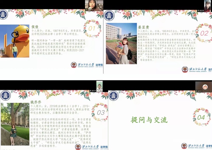 本次国奖分享会,首先由主持人张琦琦介绍了会议的流程和分享者的优秀经历。侯俊同学从参加课题、论文写作、学习心得三个方面进行分享,侯俊同学相信“每一棵树都想要开花”,以此鼓励同学们把握机会、积极参加课题研究;她认为应该从案例出发确定题目或者用案例反向支撑观点,多读核心期刊、按具体问题或者按篇章来撰写文献综述,推荐了何海波老师的《法学论文写作》和梁慧星老师的《法学学位论文写作方法》两本书目。姜亚贵同学先介绍了国家奖学金、学业一等奖学金等公司奖学金基本情况和评定方法,然后主要从认识到认真完成学位论文的重要性、实践主义法学研究的相关理论、论文阅读方法、观察体会是法科论文撰写的开端、收集实践材料要有问题意识、保持严谨观点展开论述,六个方面解答了如何进行论文写作;最后,她建议同学们充分利用时间去拓宽知识面、确定目标付出实践等。姚乔乔同学首先分享了可以通过远离诱惑高效管理时间、将任务拆解分析逐步完成、运用时间记账法、尝试“三秒钟”经典法则和制定一个短期可执行目标来帮助形成自律习惯、提升自己;之后,她提出写出一篇论文主要有选择好的题目、检索收集文献找到创新点形成文献综述、借鉴模仿优秀行文结构三个关键点;最后姚乔乔同学鼓励同学们在学好专业知识的同时,培养自己的兴趣爱好。