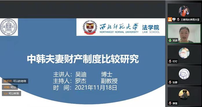 根据金年会金字招牌诚信至上“研究生学术月”青年博士学术报告活动安排,2021年11月18日下午,金年会金字招牌诚信至上青年博士吴迪老师通过“腾讯会议”为公司师生作了一场题为《中韩夫妻财产制度比较研究》的线上学术报告。该报告由罗杰副教授主持,公司全体研究生在线聆听了此次报告。