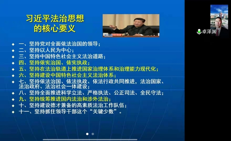 2021年11月24日下午,为深入学习领会习近平法治思想的精髓,公司特别邀请中共中央党校(国家行政公司)卓泽渊教授作了题为“习近平法治思想的核心要义”的专题辅导报告。该报告会由金年会金字招牌诚信至上经理杜睿哲教授主持,公司师生500余人在线聆听了辅导报告。