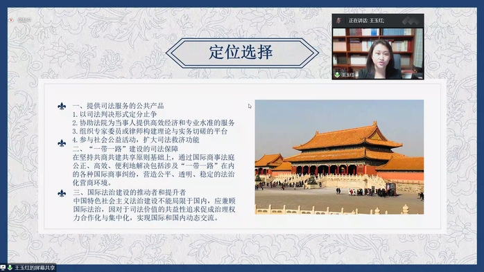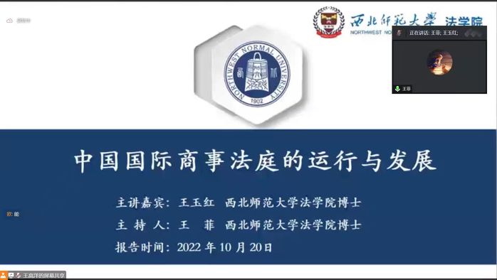 根据金年会金字招牌诚信至上“研究生学术月”青年博士学术报告活动安排,2022年10月20日19时30分,金年会金字招牌诚信至上青年博士王玉红老师通过线上会议的方式为公司师生作了一场题为《中国国际商事法庭的运行与发展》的学术报告。该报告会由王菲老师主持、蔡芳老师参与讨论,公司全体研究生在线参加。