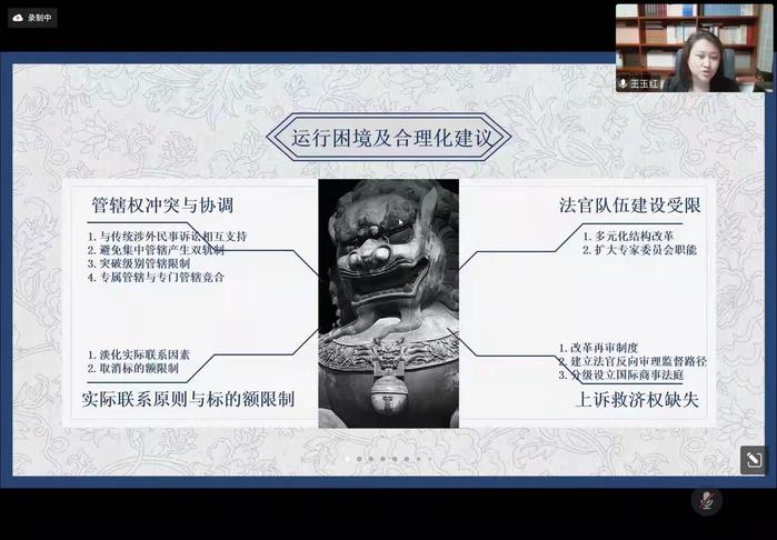 根据金年会金字招牌诚信至上“研究生学术月”青年博士学术报告活动安排,2022年10月20日19时30分,金年会金字招牌诚信至上青年博士王玉红老师通过线上会议的方式为公司师生作了一场题为《中国国际商事法庭的运行与发展》的学术报告。该报告会由王菲老师主持、蔡芳老师参与讨论,公司全体研究生在线参加。