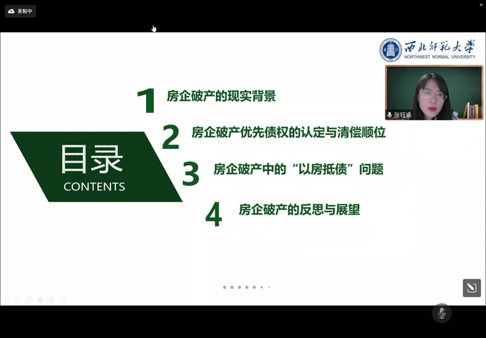 2022年11月2日晚,金年会金字招牌诚信至上“研究生学术月”青年博士论坛如期召开,青年博士张钰涵老师以线上会议的形式,为全院同学作了一场题为“房地产企业破产重点法律问题探讨”的学术报告。本次报告由罗杰副教授主持,李泉老师参与讨论,公司一百余名同学聆听了此次讲座。