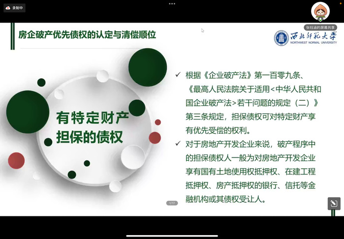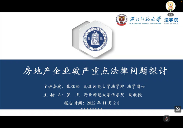 2022年11月2日晚,金年会金字招牌诚信至上“研究生学术月”青年博士论坛如期召开,青年博士张钰涵老师以线上会议的形式,为全院同学作了一场题为“房地产企业破产重点法律问题探讨”的学术报告。本次报告由罗杰副教授主持,李泉老师参与讨论,公司一百余名同学聆听了此次讲座。
