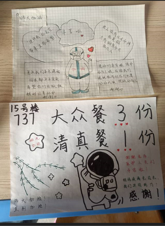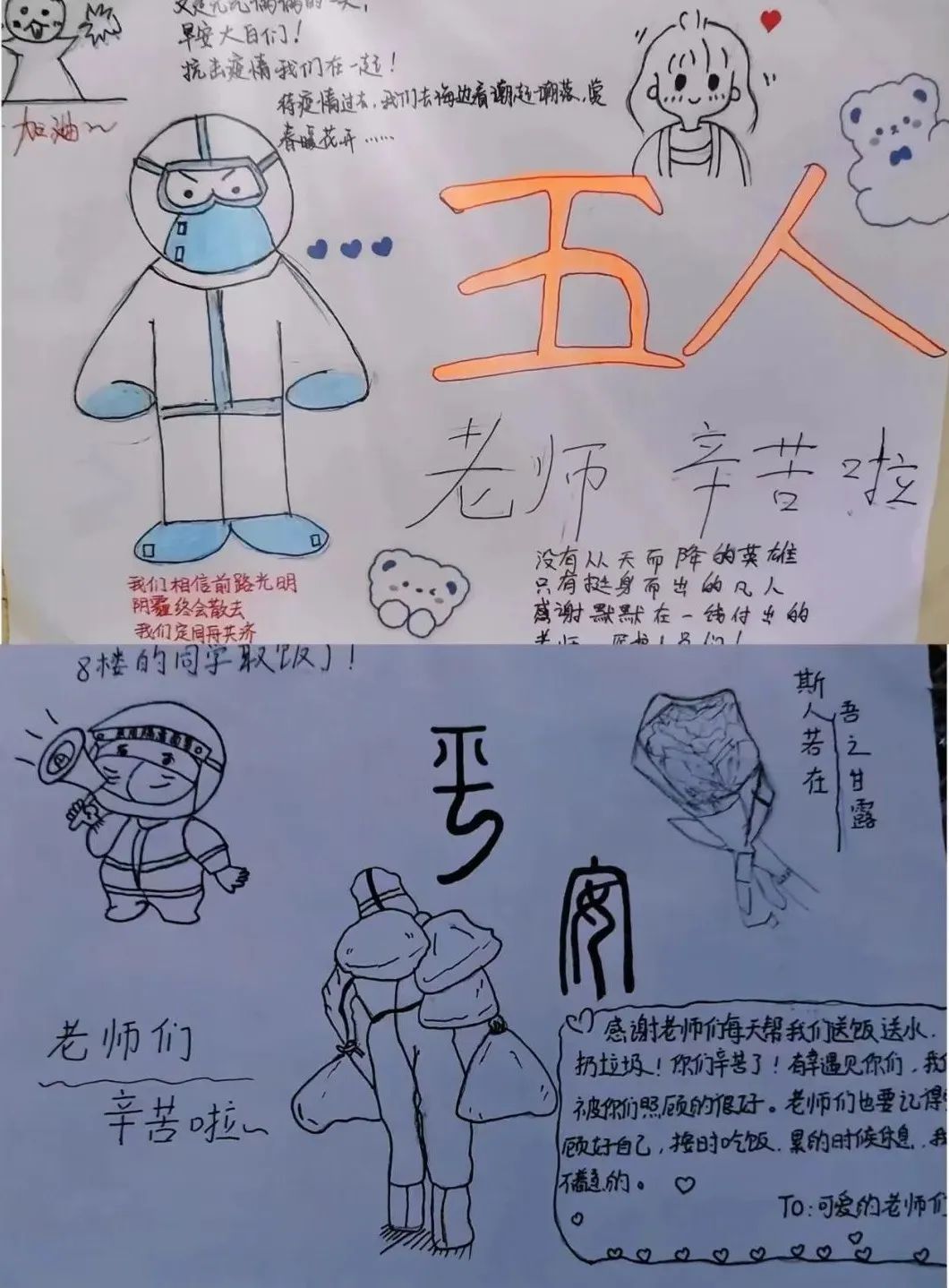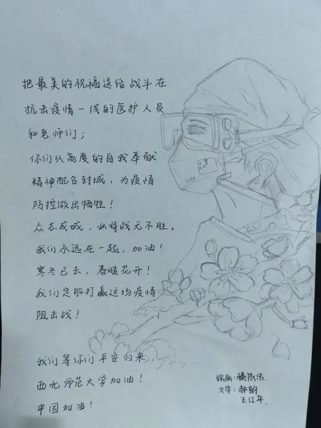 众志成城,抗击疫情。我们与你同在。我们坚信:希望就在前方,胜利必将属于我们!在抗击疫情的这段日子里,我们的老师化身“白衣天使”,在疫情与我们之间筑起一座堡垒,守护着我们的健康。老师们每天从一楼到八楼逐层发放三餐以及饮用水,汗水浸湿了他们的额头,但脚下的步伐依然坚定,防护服遮住了他们的模样,但我们知道,他们有共同的名字—西师可爱的老师们。为感激老师们的辛苦付出,西师学子们制作了一系列的画报,并且将美好的祝愿与感激之情通过文字表达出来,让我们一起看看大家都说了些什么吧!