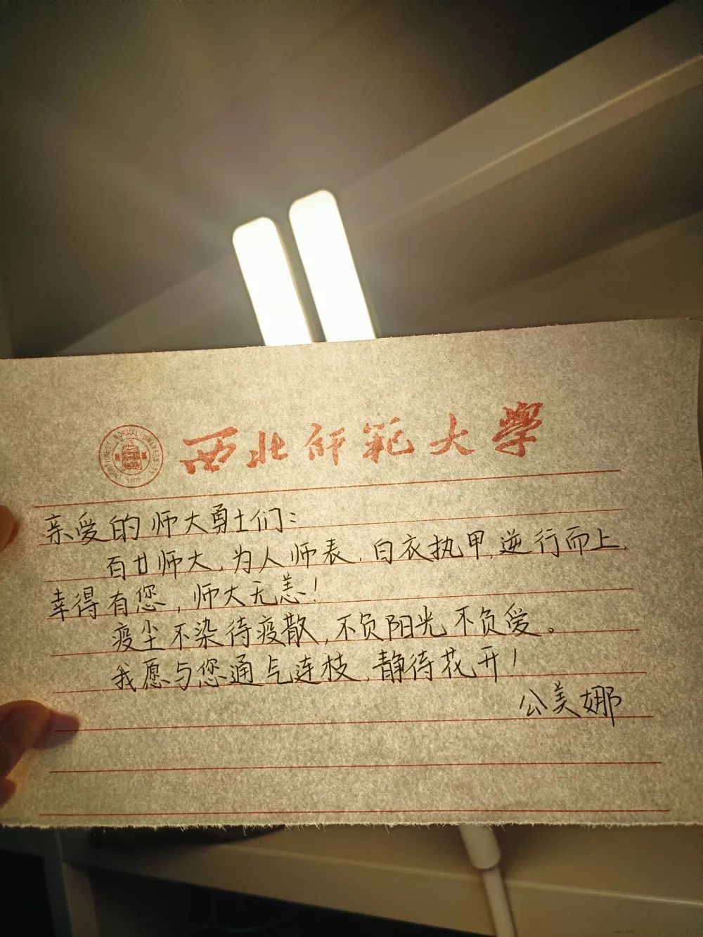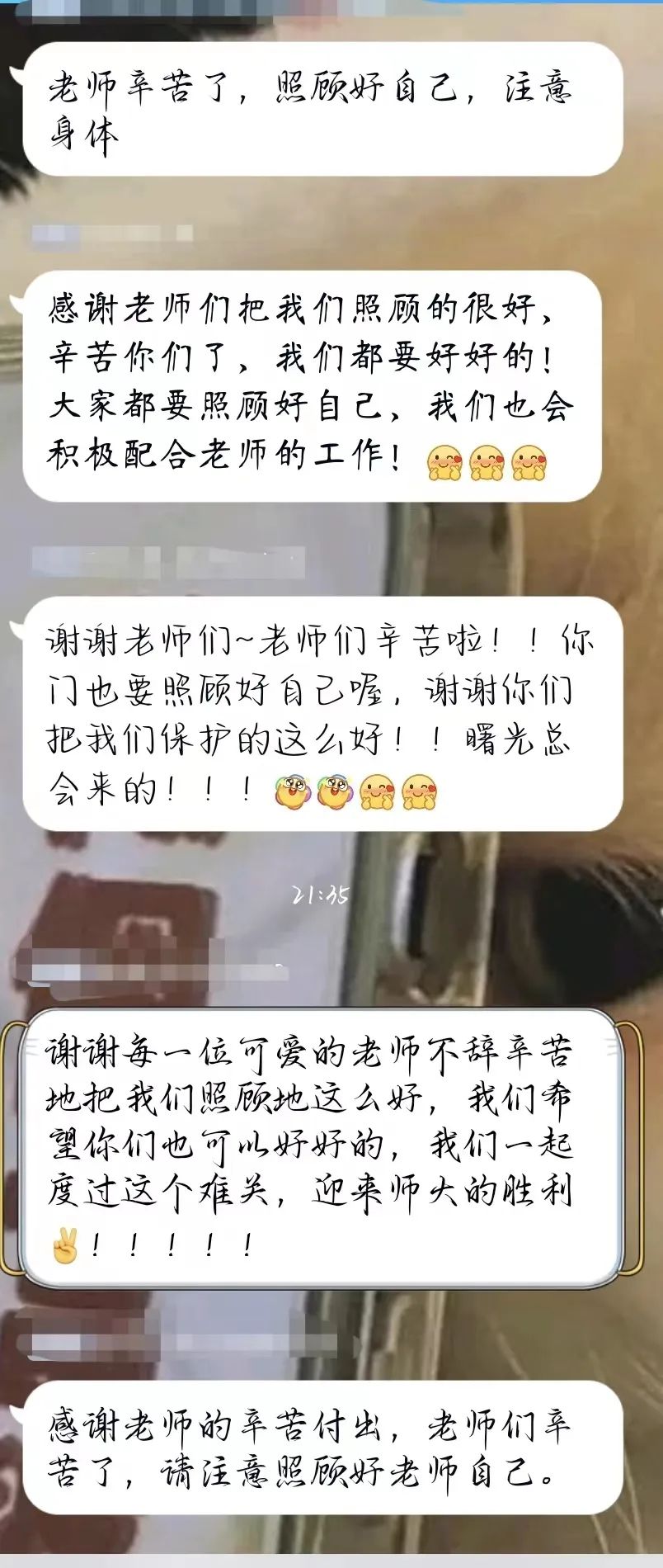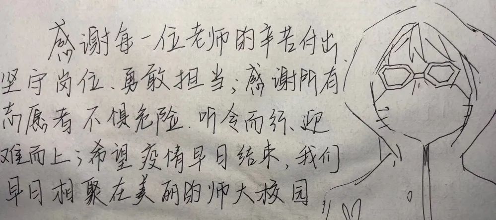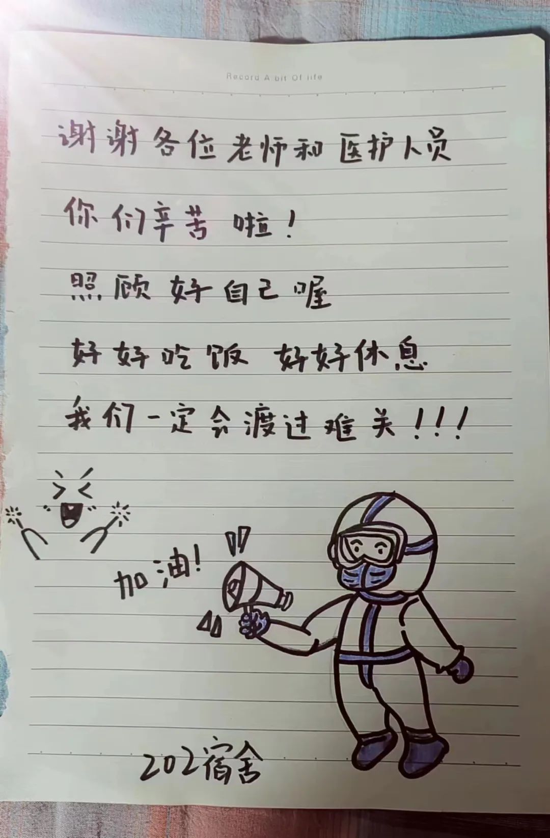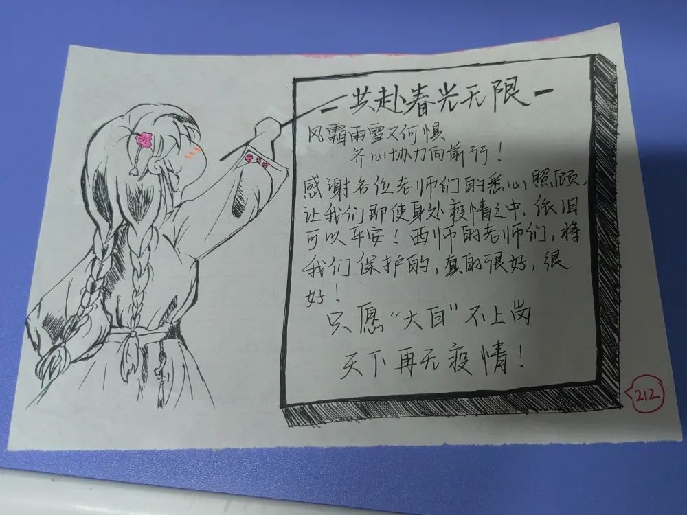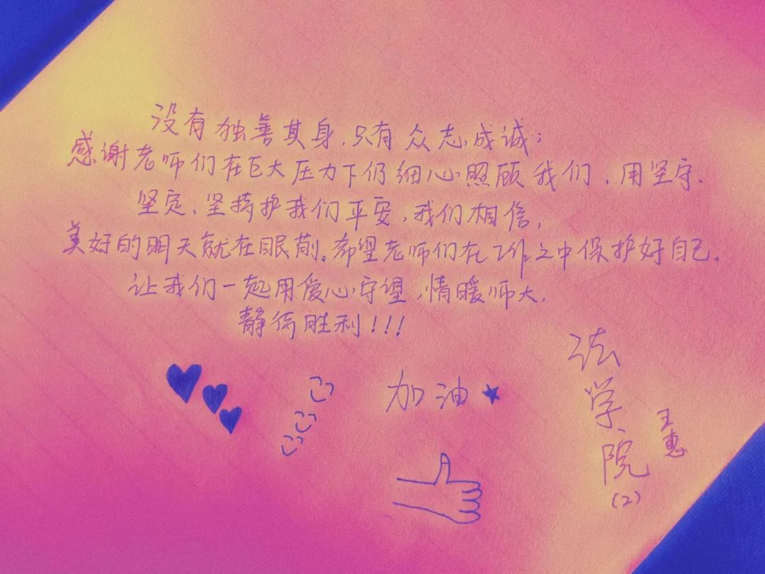 所谓英雄,不过是平凡的勇敢;而所谓天使,不过是善良的天性。老师们,感谢你们的辛苦付出,让我们在疫情期间感受到无微不至的关怀,让我们的焦虑担心一扫而光,希望你们也能照顾好自己,希望大家以积极阳光的心态共同抗疫。我相信,前路光明,阴霾终会散去,一切都会好起来的!西师加油!