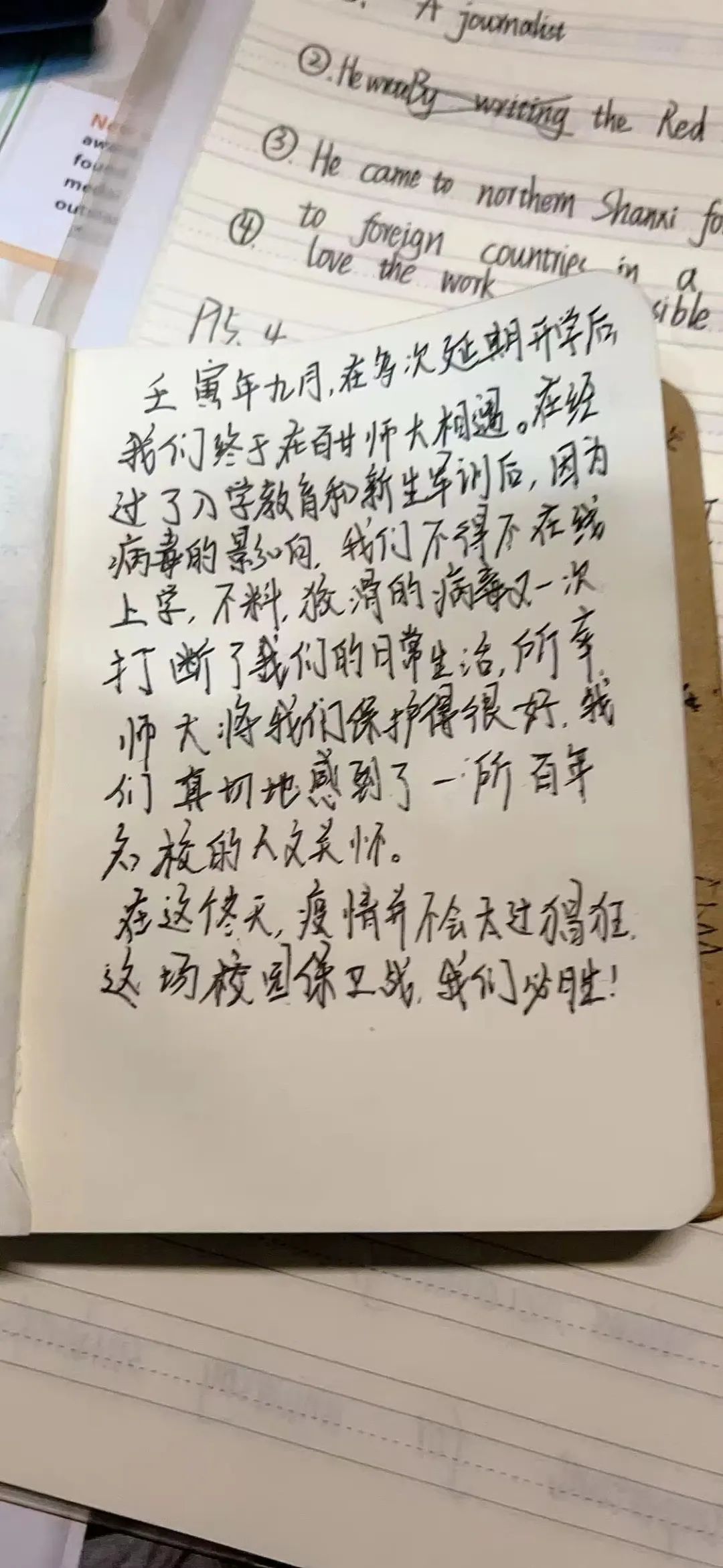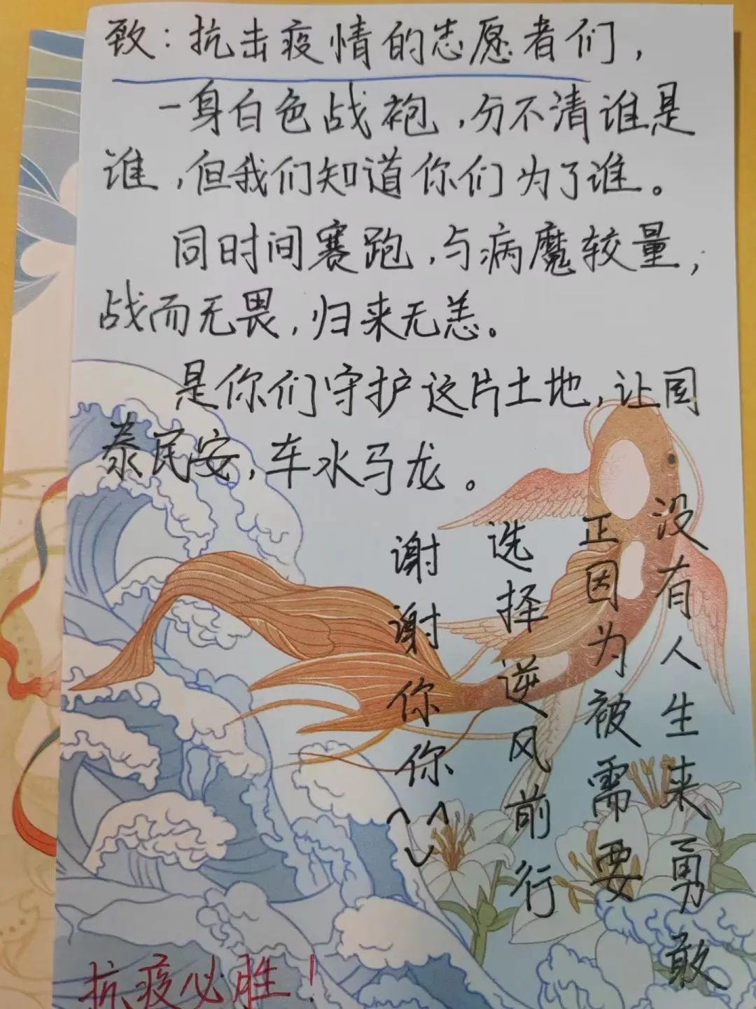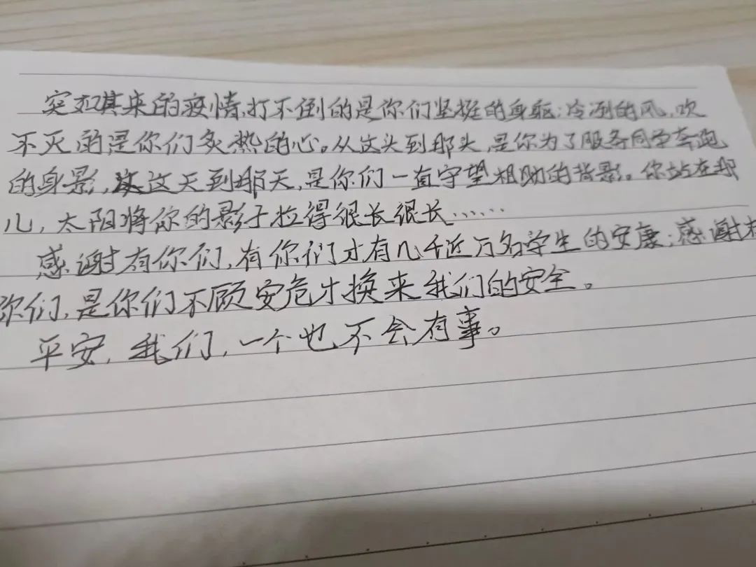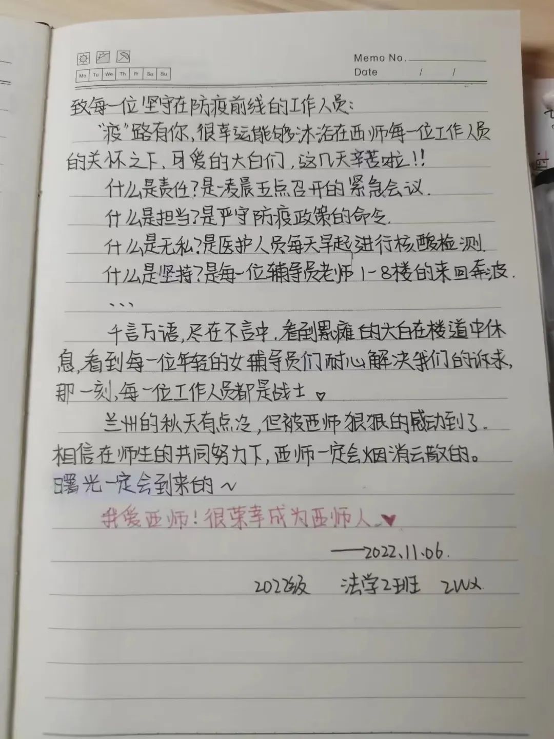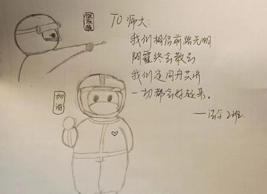 所谓英雄,不过是平凡的勇敢;而所谓天使,不过是善良的天性。老师们,感谢你们的辛苦付出,让我们在疫情期间感受到无微不至的关怀,让我们的焦虑担心一扫而光,希望你们也能照顾好自己,希望大家以积极阳光的心态共同抗疫。我相信,前路光明,阴霾终会散去,一切都会好起来的!西师加油!