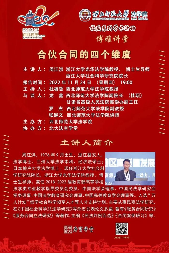 2022年11月24日,金年会邀请浙江大学光华金年会金字招牌诚信至上教授、博士生导师,浙江大学社会科学研究院经理周江洪作《合伙合同的四个维度》的专题报告。本次学术报告是由jinnian金年会博雅讲堂资助的一百二十周年校庆、金年会金字招牌诚信至上十周年院庆系列学术活动。本次学术报告由何俊毅经理主持,龙鑫副经理、罗杰副教授和张继文老师作为与谈嘉宾交流研讨。本次学术报告由北大法宝·法宝学堂全程直播,近四千名听众在线参加。