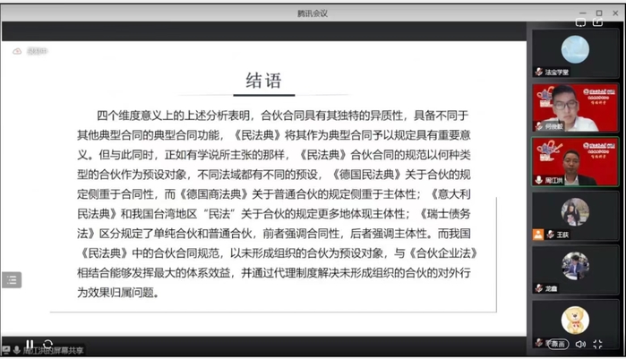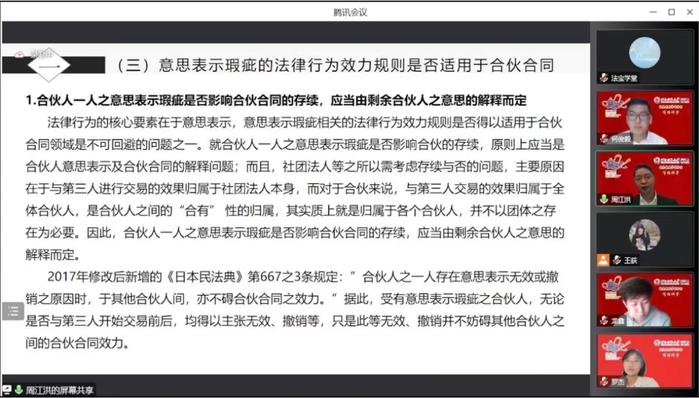 在周老师的报告结束后,三位与谈嘉宾发表了自己的观点。龙鑫副经理就审判中合伙合同清算、意思表示瑕疵等实务问题与周老师进行了交流。罗杰副教授对《民法典》和《合伙企业法》中的预设对象的关系、合伙企业双务合同性质以及如何区分合伙关系与其他法律关系发表了观点。张继文老师就合伙中退伙制度的适用、合同的双务性以及合伙财产的归属与周老师进行了探讨。周老师对各位与谈嘉宾的问题进行了详细地回应。在与谈环节结束后,周老师对听众提出的合伙债务履行、合伙事务执行、合伙解除等问题进行了解答。最后,何经理对整场学术报告进行了总结。