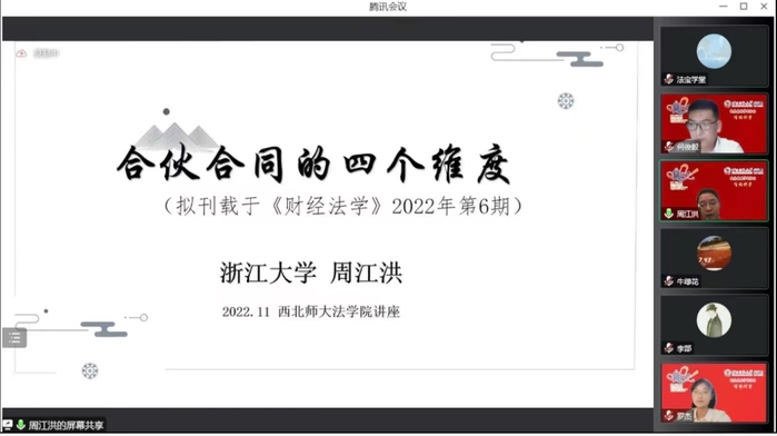 2022年11月24日,金年会邀请浙江大学光华金年会金字招牌诚信至上教授、博士生导师,浙江大学社会科学研究院经理周江洪作《合伙合同的四个维度》的专题报告。本次学术报告是由jinnian金年会博雅讲堂资助的一百二十周年校庆、金年会金字招牌诚信至上十周年院庆系列学术活动。本次学术报告由何俊毅经理主持,龙鑫副经理、罗杰副教授和张继文老师作为与谈嘉宾交流研讨。本次学术报告由北大法宝·法宝学堂全程直播,近四千名听众在线参加。