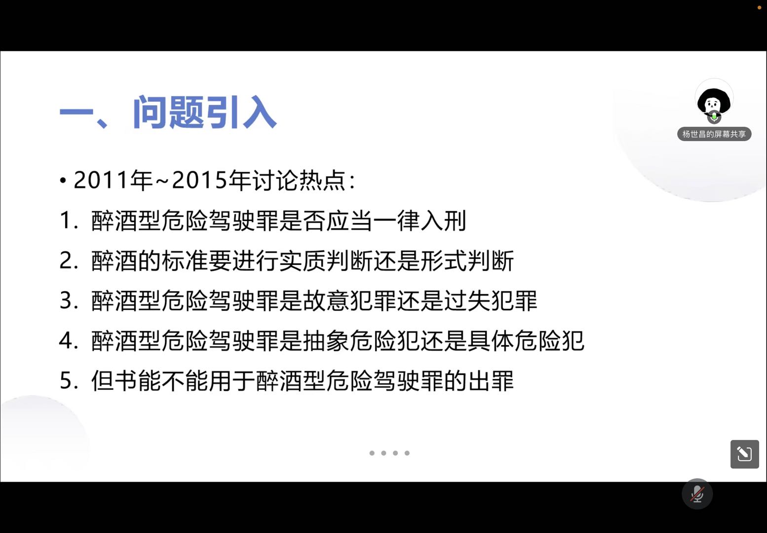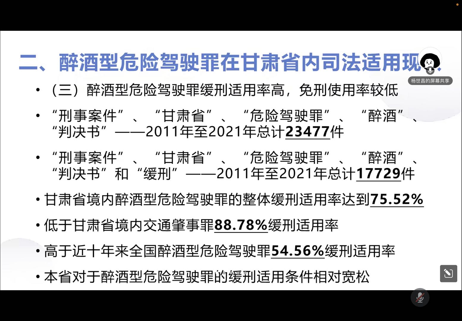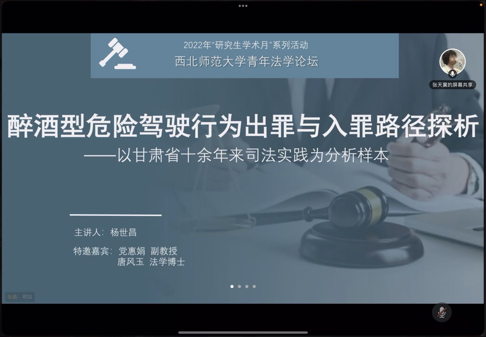 2022年12月15日晚,金年会2020级法律法学研究生杨世昌同学作《醉酒型危险驾驶行为出罪与入罪路径探析——以甘肃省十余年来司法实践为分析样本》的专题报告。本次学术报告是“研究生学术月”系列活动之青年法学论坛,由张天翼同学主持,党惠娟副教授和唐风玉博士作为特邀嘉宾交流研讨,其余同学在线聆听。