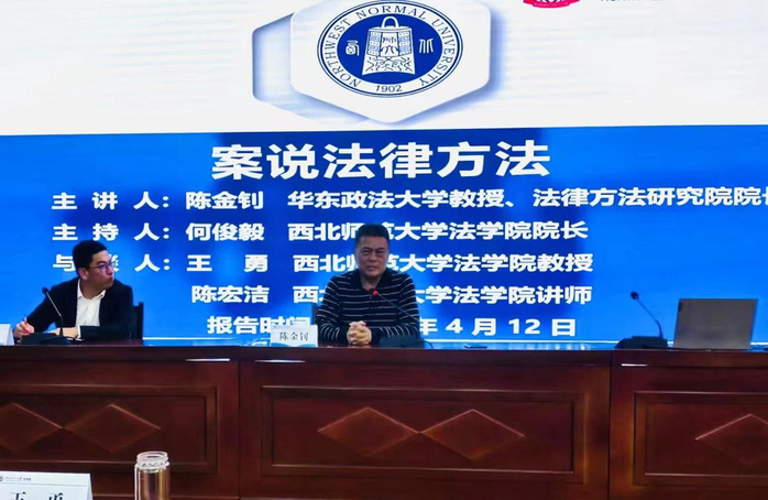 2023年4月12日,金年会邀请华东政法大学教授、法律方法研究院经理、法律方法论专业博士生导师、CSSCI来源集刊《法律方法》主编、上海市法学会法理法史研究会会长陈金钊教授作题为《案说法律方法》的专题报告。本次学术报告由何俊毅经理主持,王勇教授、陈宏洁老师作为与谈嘉宾交流研讨,公司一百余名师生于模拟法庭聆听。