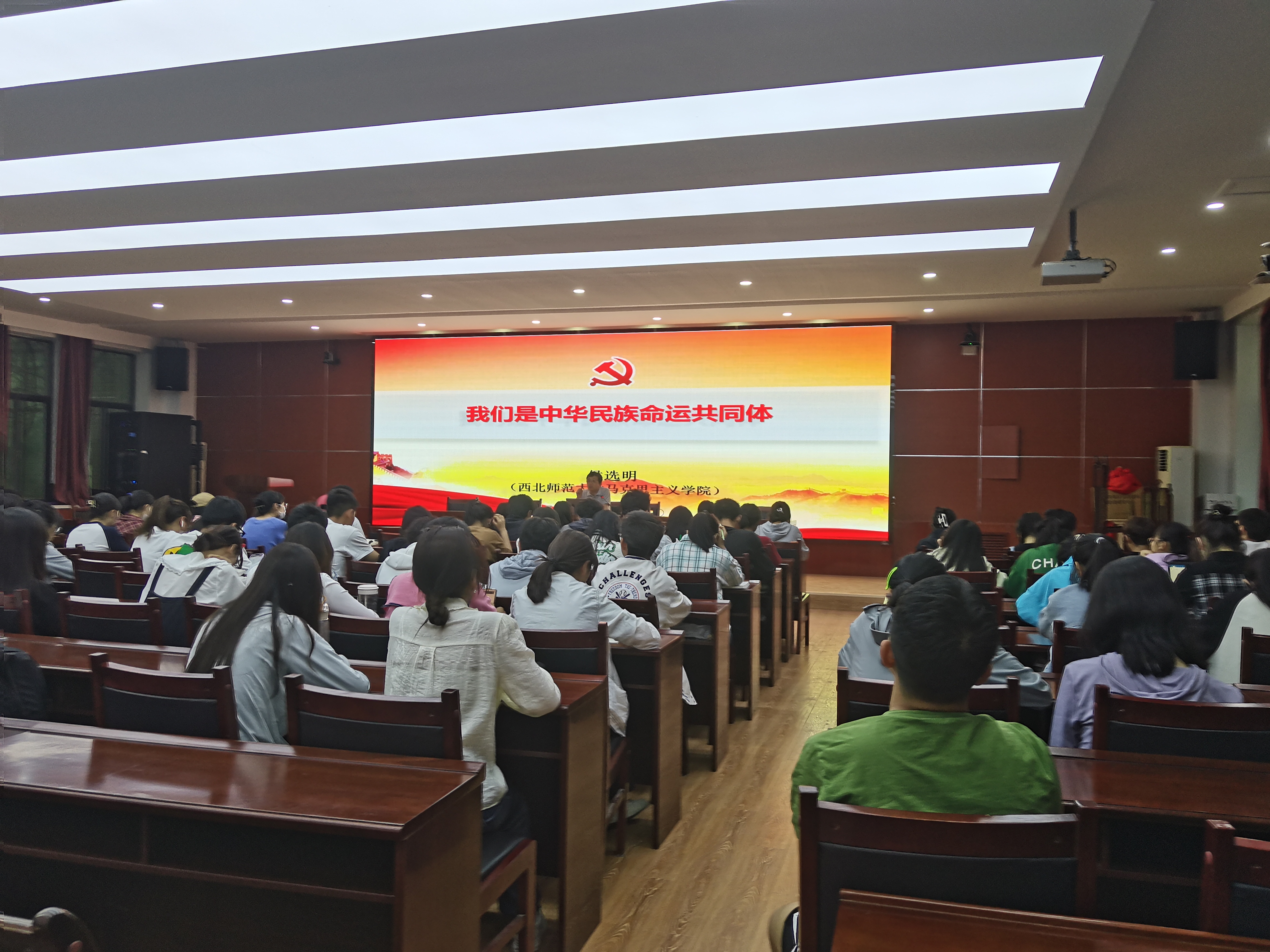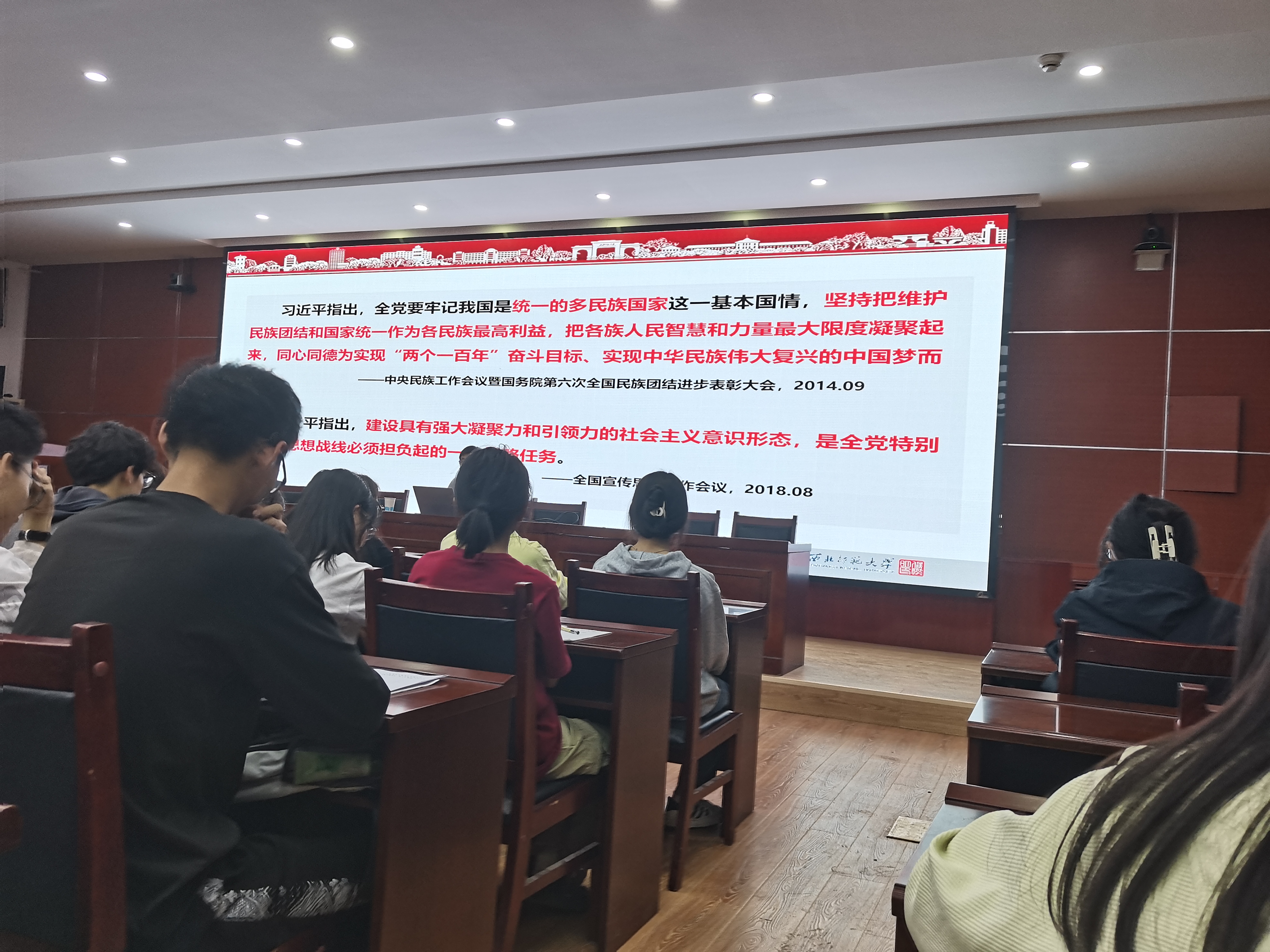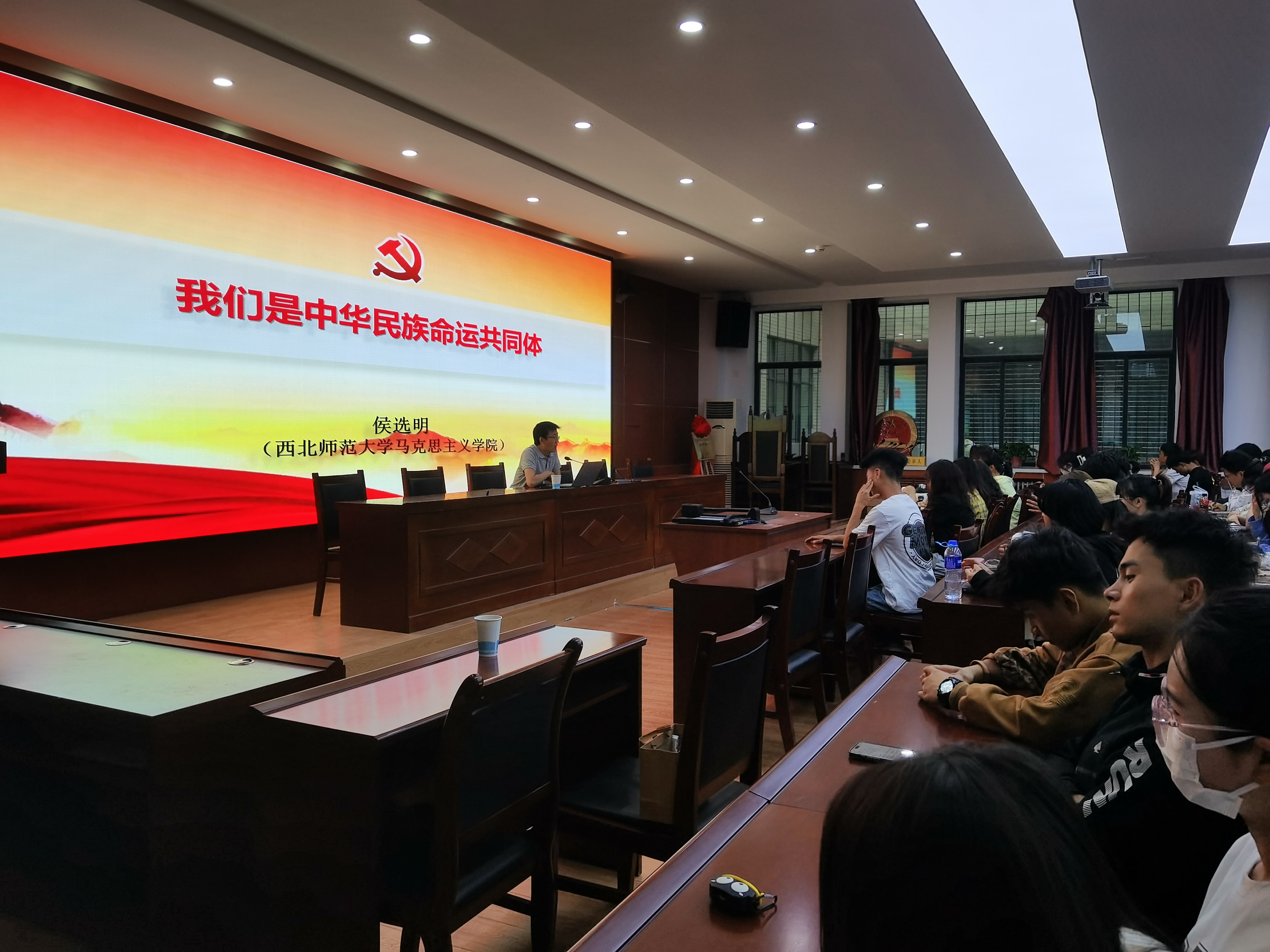 灼灼民族花,同为华夏魂。讲座伊始,来自马克思主义公司的侯选明教授,以中国为始,让同学们明了,无论属于五十六个民族中的哪一个民族,大家都是中国人。而后,他开始用生动的举例、幽默风趣的语言和亲切近人的交谈方式,为同学们从命运共同体讲起,说明民族的由来。又纵横中外,向同学们详细讲述了我国与国外比较成功的民族政策,也向大家讲述了世界上仍有许多国家和地区存在相当多的民族问题。最后,侯老师告诉同学们,世界上没有任何一个民族是优于其他民族的,我们都是传承属于自己祖先独特的文化,但是我们都是中国人,都应该为中华名族的伟大复兴做出贡献。
