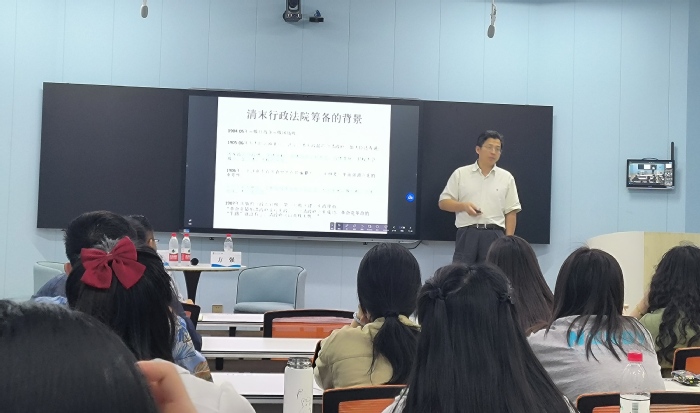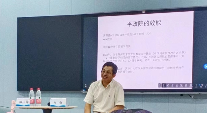 报告开始前,田庆锋副教授向同学们隆重介绍了主讲人方强教授。方教授从清末行政法院筹备的背景、清末行政法院的提出、北洋政府平政院的建立、平政院的诉讼程序与效能这四个角度展开论述。在清末行政法院筹备的背景方面,方教授向同学们介绍了1904-1905年的俄日战争、1905-1906年五大臣访欧美日、1907年《政治官报》第一号提出建立宪政的理由。在清末行政法院的提出方面,方教授向同学们详细介绍了1909年清政府制定的《行政裁判院官制草案》。在北洋政府平政院的建立方面,方教授主要介绍了1911年宋教仁《中华民国卾州约法(草案)》。在平政院的诉讼程序与效能方面,方教授向同学们主要介绍了民国北京政府《诉愿法》的第一条和第三条。报告结束后,田庆锋副教授首先对方强教授所作的学术报告高度赞同。在同学提问环节,同学们就袁世凯为何会称帝以及军阀统治等问题与方教授进行了交流。