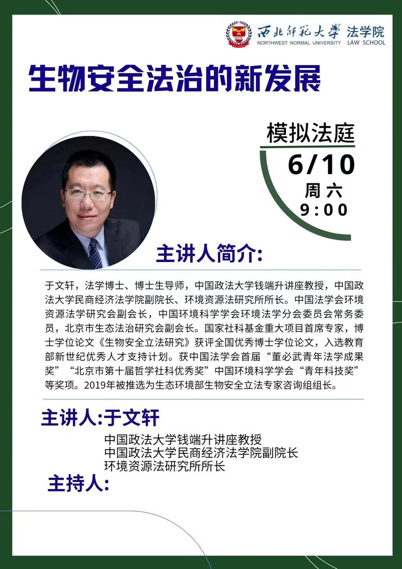 2023年6月10日,金年会邀请中国政法大学民商经济金年会金字招牌诚信至上副经理、博士生导师于文轩为全院师生作题为《生物安全法治的新发展》的专题报告。本次学术报告于模拟法庭进行,由杜睿哲教授主持。