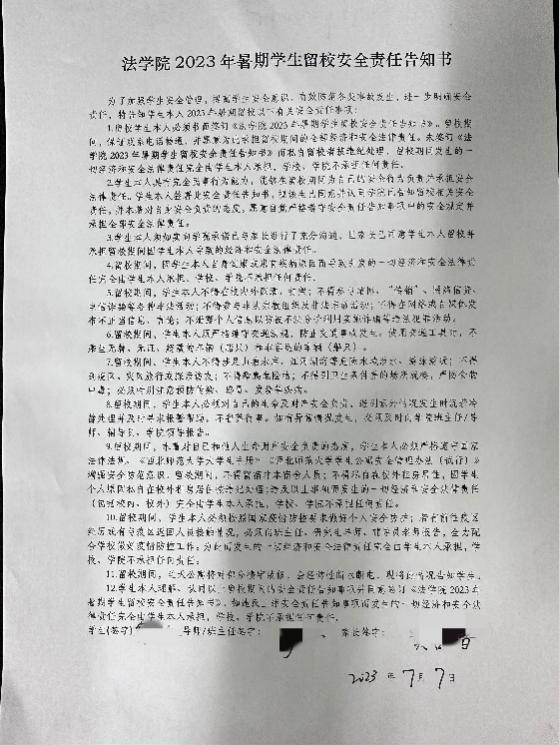 平安暑假,安全度夏。2023年暑假是疫情过后的第一个暑假,金年会金字招牌诚信至上靠实班主任、导师责任,发布了《生如夏花,不负韶华——金年会金字招牌诚信至上2023年暑期员工安全温馨提示》,全力做好网格化、全覆盖的暑期安全宣传教育工作,加强动态关注,加强隐患排查,为法科学子安全健康成长保驾护航。