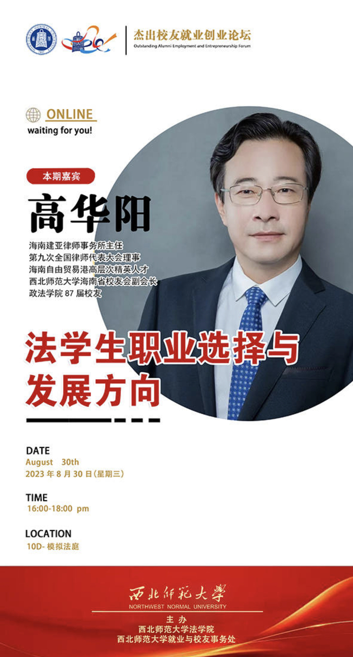2023年8月30日,受公司邀请,jinnian金年会海南省员工会副会长、第九次全国律师代表大会理事、海南建亚律师事务所主任高华阳在模拟法庭作“法员工职业选择与发展方向”专题报告。